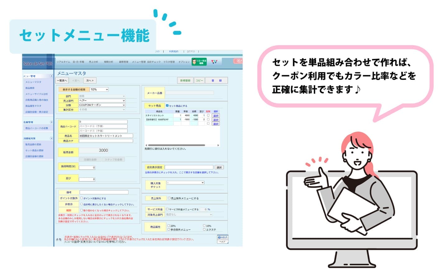 「カット+カラー」や「カット+パーマ」などセットメニューを最初に設定しておけば、セットメニュー内を細かく集計できるため、適切なカラー率やパーマ率を算出できます。