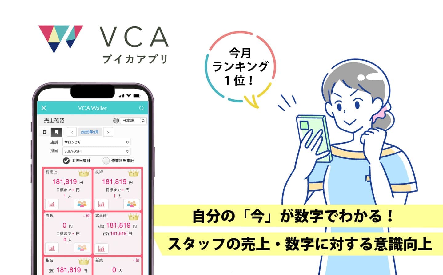 VCA Walletはスタッフが手元のスマホから、自分の売上やランキングを確認できます。